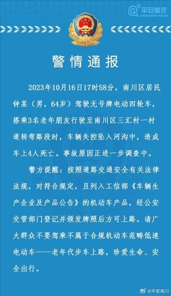 ·重慶警方通報(bào):老人駕駛無(wú)牌電動(dòng)四輪車(chē)搭載3名老年朋友失控墜河,4人死亡。
