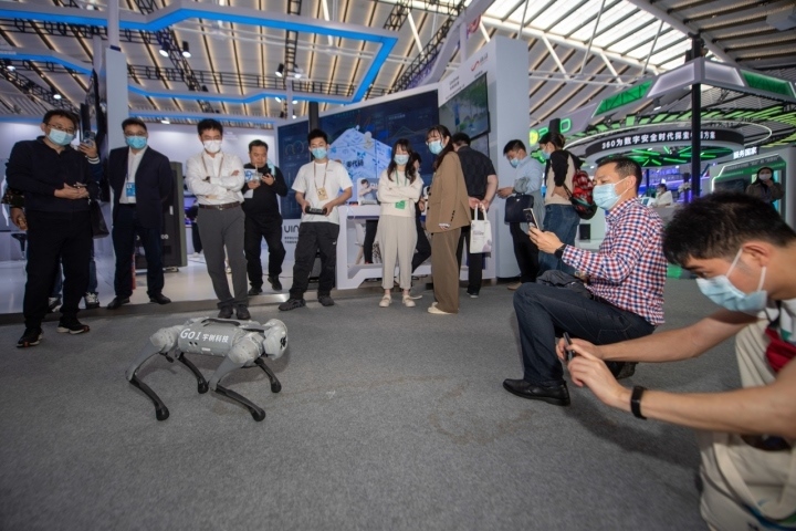 2022年11月10日,觀眾在“互聯(lián)網(wǎng)之光”博覽會上參觀機(jī)器狗表演。新華社