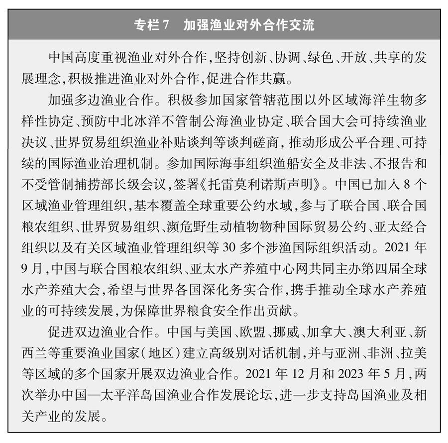 當前,漁業(yè)資源的持續(xù)利用面臨氣候和環(huán)境變化等威脅,漁業(yè)資源的跨區(qū)域分布、流動性和洄游性也呈現(xiàn)出新的特點,決定了漁業(yè)管理必須進一步加強國際合作。中國深入踐行海洋命運共同體理念,深化遠洋漁業(yè)對外交流,多渠道、多形式開展互利共贏合作,不斷鞏固多雙邊政府間漁業(yè)合作機制,助力合作國家和地區(qū)漁業(yè)發(fā)展。