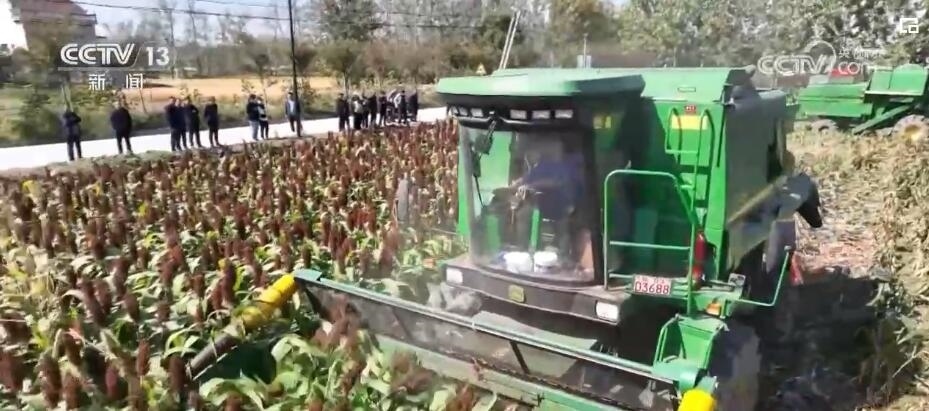 在江蘇灌南,萬(wàn)畝高粱開鐮收割。一臺(tái)臺(tái)大型收割機(jī)將粒粒高粱收入囊中。