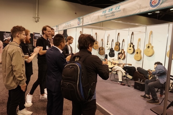 4月13日,在美國加利福尼亞州阿納海姆會展中心,參觀者在中國貴州正安吉他產(chǎn)業(yè)園一家公司展位觀看樂器表演。