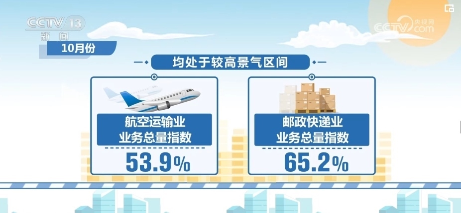 10月份,航空運輸業(yè)業(yè)務總量指數(shù)為53.9%,郵政快遞業(yè)業(yè)務總量指數(shù)為65.2%,均處于較高景氣區(qū)間。