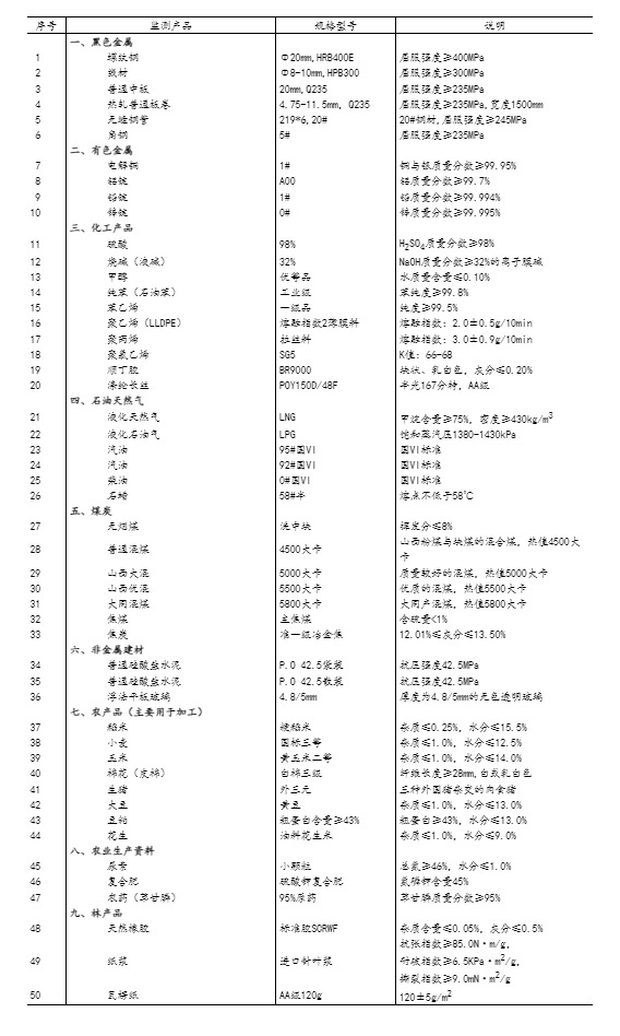 流通領(lǐng)域重要生產(chǎn)資料市場價(jià)格監(jiān)測內(nèi)容包括9大類50種產(chǎn)品的價(jià)格。類別與產(chǎn)品規(guī)格說明詳見附表。