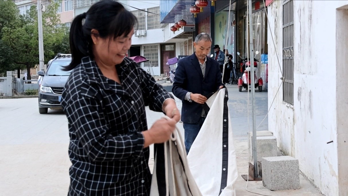 下午4點,夫妻倆開始忙活,盤整放映設(shè)備,把音響、銀幕、放映機,一件件裝車。下午五點半,到達放映的地方,兩人麻利地安裝起銀幕架子??措娪暗膱雒鏇]有了多年前的壯觀,搬著小板凳、小馬扎來看電影的,大都是老人和小孩。