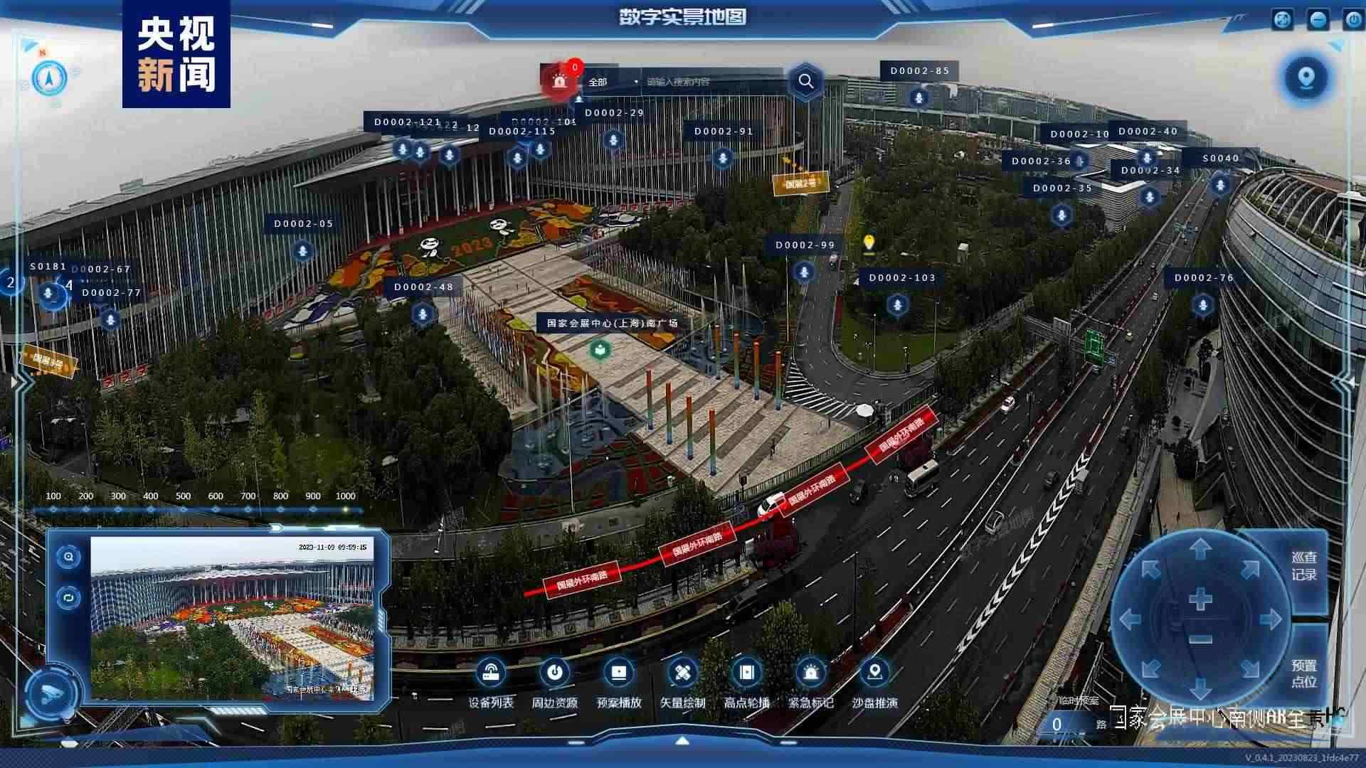 為強化精準(zhǔn)指揮調(diào)度,消防部門專門制作了國家會展中心的三維模型,將本屆參展的1888個展位全部進行了數(shù)字化標(biāo)識,在指揮平臺主頁面可實現(xiàn)目標(biāo)展位一鍵搜索和快速定位。以6.1號館為試點,通過激光雷達和可見光融合傳感器進行快速掃描,建立展臺的三維精模,配置安保模型算法,將現(xiàn)場監(jiān)控攝像頭傳回的二維畫面與三維模型匹配,實現(xiàn)虛實場景交互融合。同時通過采集巡館人員面部、著裝等特征信息,利用AI算法,實時在館內(nèi)人群中標(biāo)定巡館人員,進行精準(zhǔn)定位。一旦發(fā)現(xiàn)異常狀況,指揮部值班人員能快速、精準(zhǔn)地向所有駐防人員提供最佳處置線路指引和最優(yōu)輔助決策。
