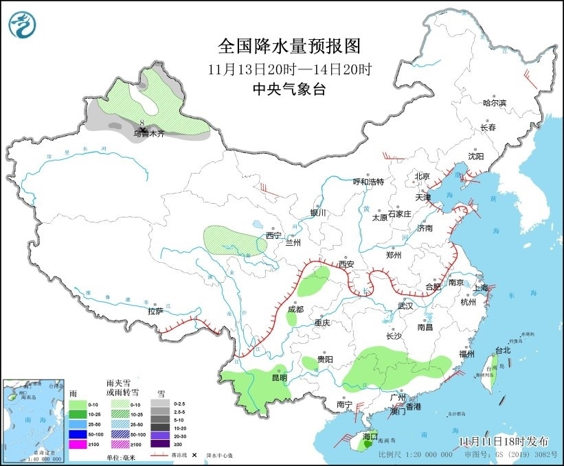 11月12日20時(shí)至13日20時(shí),新疆北部、甘肅南部等地部分地區(qū)有小雪或雨夾雪,其中,新疆阿勒泰和伊犁河谷等地部分地區(qū)有中到大雪(5~7毫米)。西南地區(qū)東南部、江南西部、華南西北部、海南島等地部分地區(qū)有小到中雨。內(nèi)蒙古中部、黑龍江東北部、遼東半島、山東半島、浙江東部、廣西東南部沿海等地部分地區(qū)有4~6級(jí)風(fēng)。渤海、黃海、東海大部海域以及臺(tái)灣海峽部分區(qū)域?qū)⒂?~8級(jí)風(fēng),陣風(fēng)可達(dá)9級(jí)(見(jiàn)圖5)。
