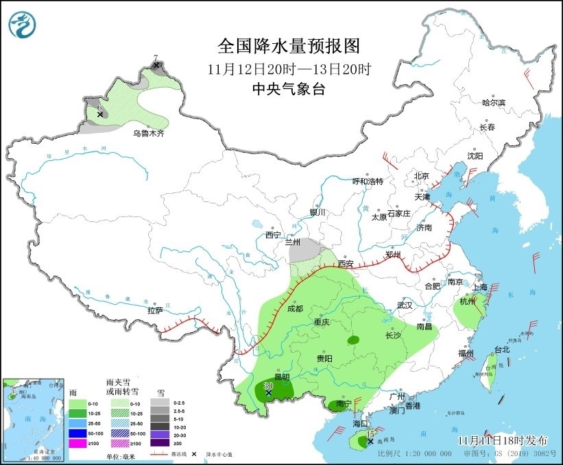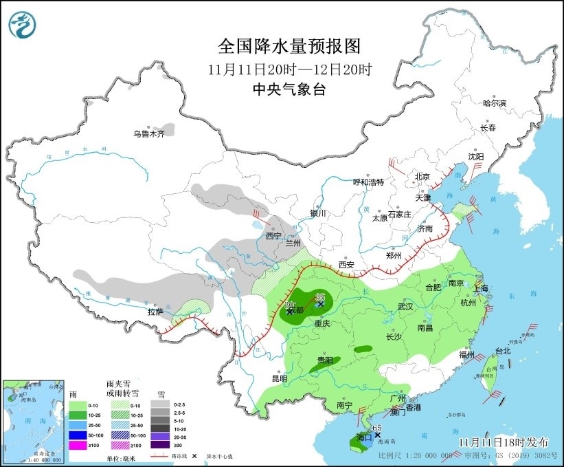 11月11日20時(shí)至12日20時(shí),新疆沿天山地區(qū)、西藏中部和東部、青海北部和東南部、甘肅中南部和河西、山東半島、川西高原北部等地部分地區(qū)有小雪或雨夾雪。四川盆地、貴州南部、湖南西南部、海南島等地部分地區(qū)有中到大雨,局地有暴雨(50~65毫米)。遼東半島、青海北部、河北北部、山東半島、四川盆地中部、浙江東部等地部分地區(qū)有5~6級(jí)風(fēng)。東海南部、臺(tái)灣海峽、臺(tái)灣以東洋面、巴士海峽、南海北部和中部、北部灣有7~8級(jí)、陣風(fēng)9級(jí)的大風(fēng)(見(jiàn)圖4)。