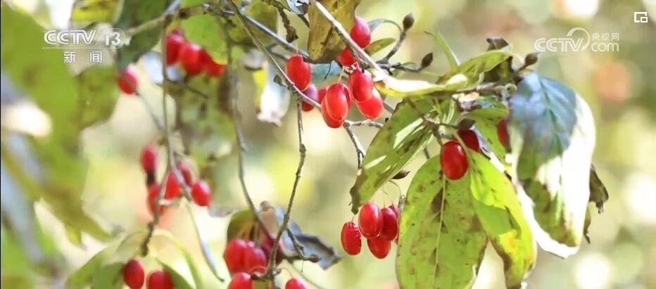 山林間,成片的山茱萸樹在褪去枯葉后,紅彤彤的果實便顯露出來,密密麻麻綴滿枝頭。種植戶們穿梭林間,忙著采摘。
