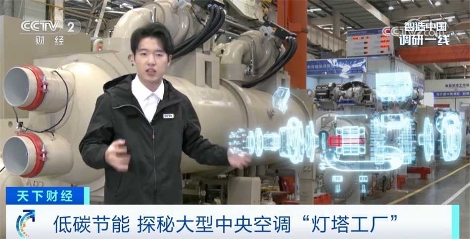 總臺(tái)央視記者 吳柏辰:今天我們來到的是位于山東青島的一家生產(chǎn)中央空調(diào)的“燈塔工廠”,這里生產(chǎn)的空調(diào)跟我們平時(shí)家用的不一樣,我身邊這樣的大家伙就是一臺(tái)商用中央空調(diào)的主機(jī)。要知道一棟寫字樓或者商場,空調(diào)制冷和制熱的能耗往往能能夠占到整體能耗的60%以上。這種大型空調(diào)如何用最少的電獲得最大的制冷或制熱效果?關(guān)鍵就在于空調(diào)主機(jī)的壓縮機(jī),我們可以看到在這臺(tái)空調(diào)頂端的這個(gè)白色裝置氣懸浮壓縮機(jī),它采用的就是一種空氣動(dòng)力學(xué)技術(shù)。就像我們熟知的飛機(jī)機(jī)翼通過上下空氣流動(dòng)的速度不同所產(chǎn)生的浮力,它就運(yùn)用了同樣的原理。