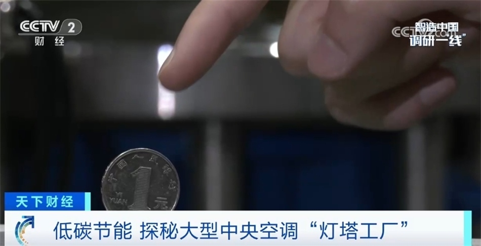 我現(xiàn)在走進(jìn)的這個(gè)區(qū)域是空調(diào)產(chǎn)線的末端——檢測平臺(tái)。每一臺(tái)空調(diào)出廠前都要在這里經(jīng)過全方位的檢測。眼前這就是一臺(tái)正在運(yùn)轉(zhuǎn)的氣懸浮中央空調(diào),我們在空調(diào)上立了一枚硬幣,可以看到是紋絲不動(dòng)的,這也是氣懸浮的特點(diǎn)之一——運(yùn)行比較平穩(wěn)。在這塊屏幕上顯示著空調(diào)的出水溫度7℃,恒定的出水溫度讓這臺(tái)空調(diào)產(chǎn)生的冷風(fēng)非常柔和。目前,這座工廠全流程的自動(dòng)化生產(chǎn)能夠滿足從小型商用空調(diào)生產(chǎn)到用戶需求的大規(guī)模定制。目前低能耗、智能化產(chǎn)品已應(yīng)用在商業(yè)地產(chǎn)、酒店、軌道交通等各種場景,極大程度助力著國家“雙碳”政策以及各大行業(yè)的低碳轉(zhuǎn)型。