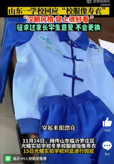 ·山東一學(xué)校校服被質(zhì)疑像壽衣,當(dāng)?shù)亟腆w局:該樣式方案已被淘汰。