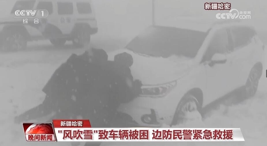 新疆哈密:“風(fēng)吹雪”致車輛被困 邊防民警緊急救援