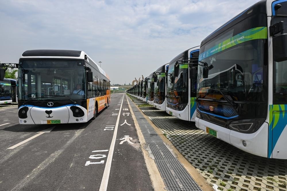 這是負(fù)責(zé)成都第31屆世界大學(xué)生夏季運(yùn)動會交通保障的新能源公交車。新華社記者王曦 攝