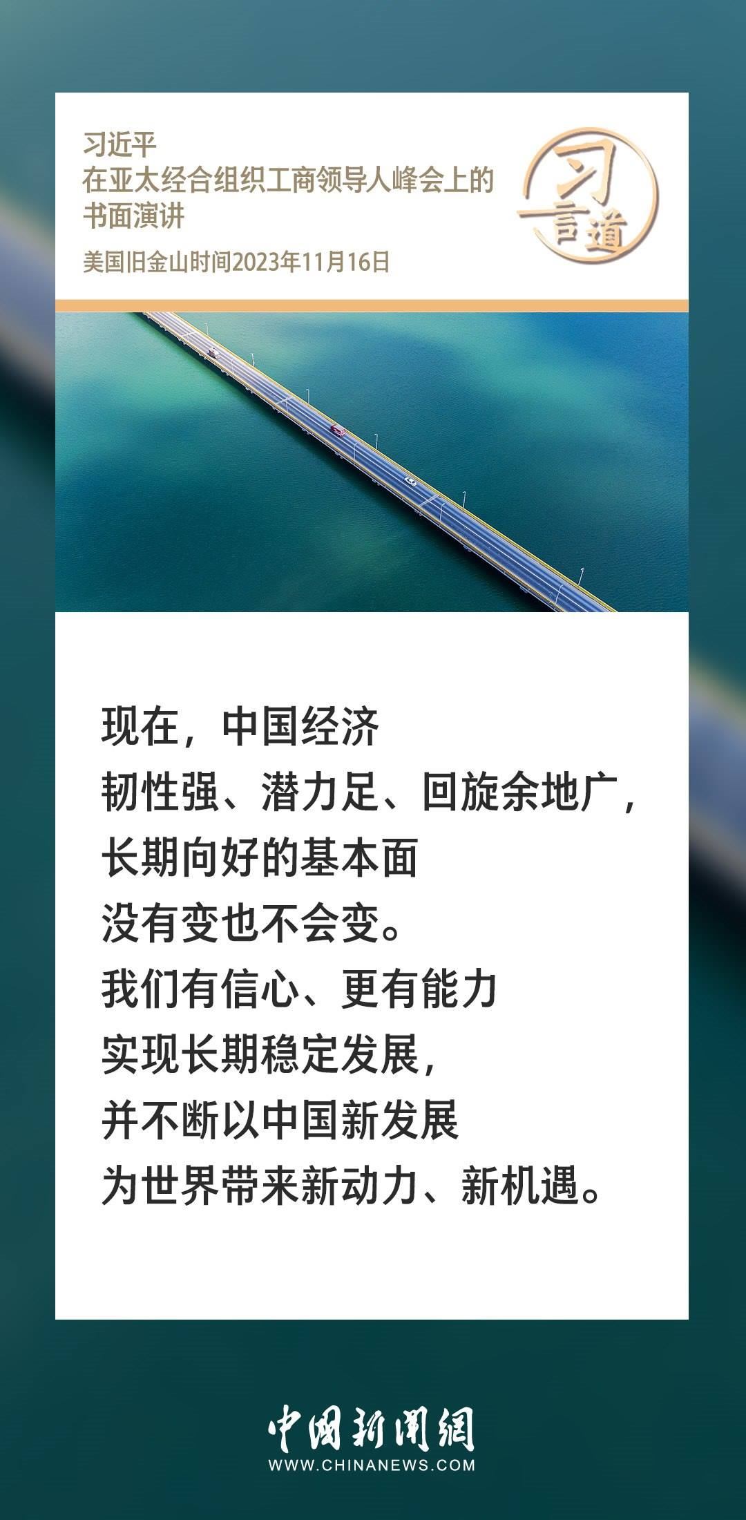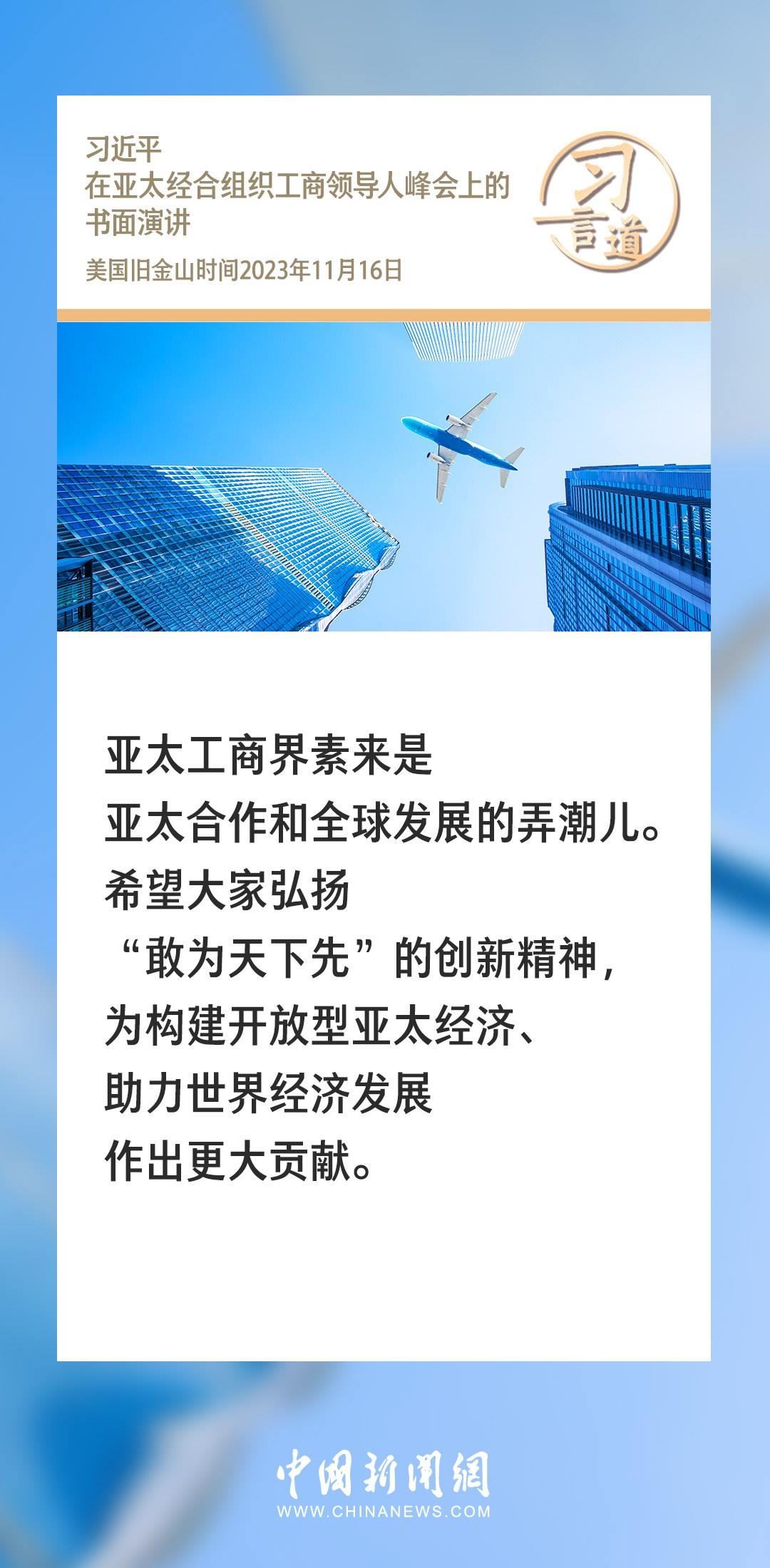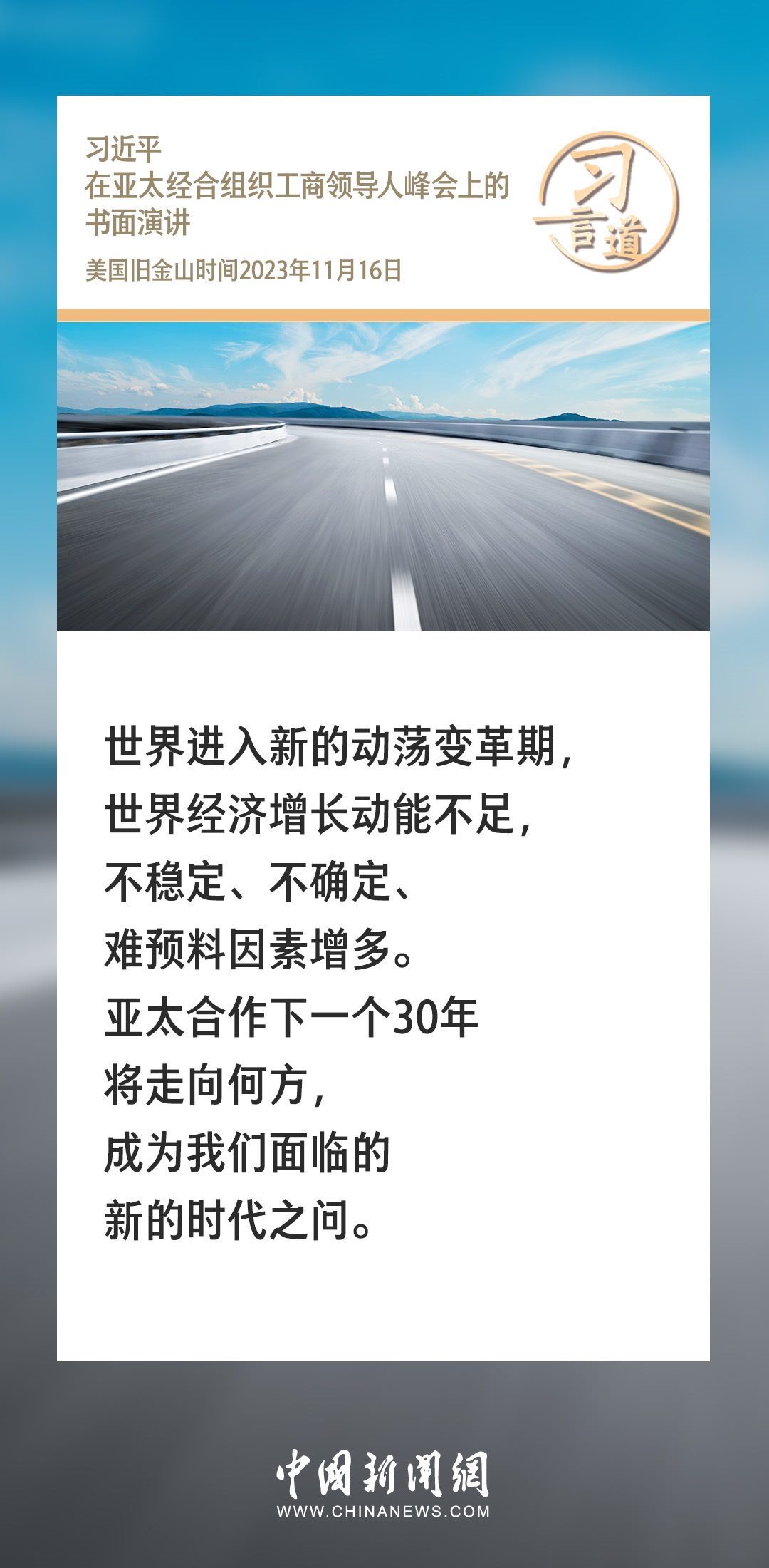 當(dāng)?shù)貢r間11月16日上午,國家主席習(xí)近平向在舊金山舉行的亞太經(jīng)合組織工商領(lǐng)導(dǎo)人峰會發(fā)表題為《同心協(xié)力 共迎挑戰(zhàn) 譜寫亞太合作新篇章》的書面演講。習(xí)近平指出——