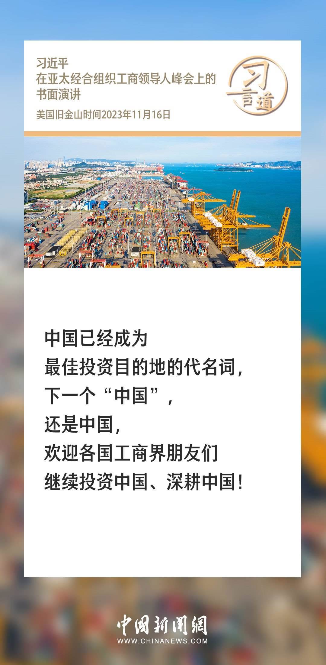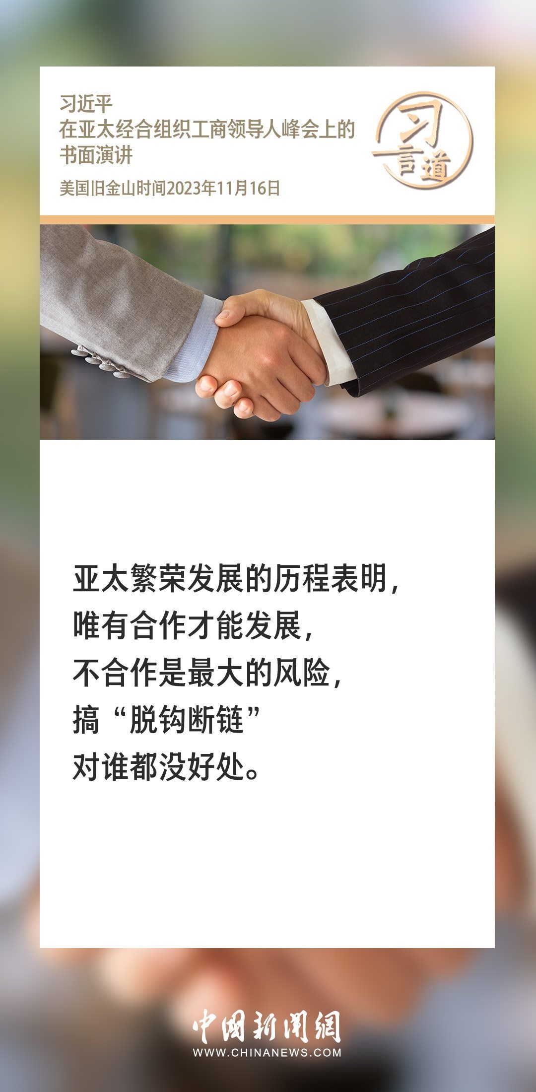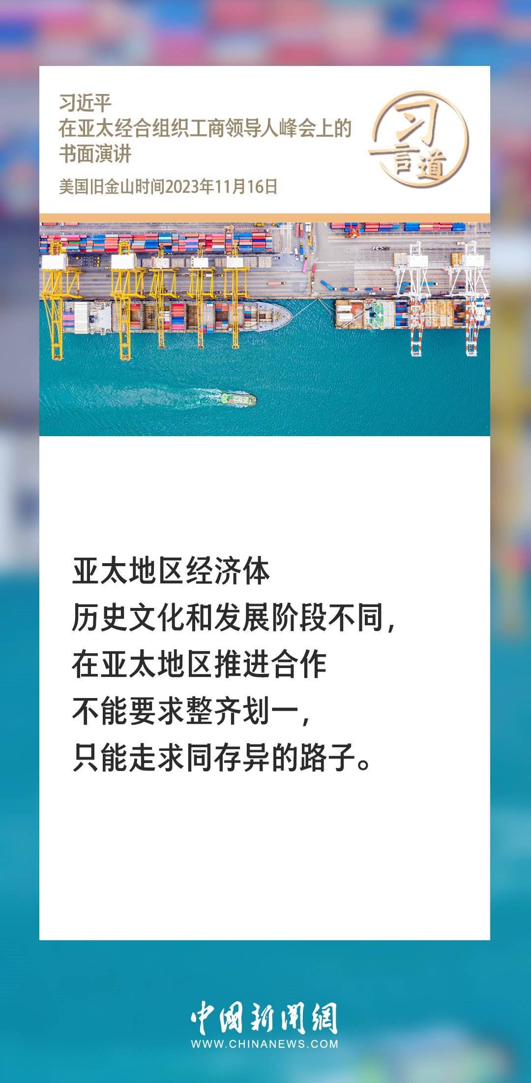 當(dāng)?shù)貢r間11月16日上午,國家主席習(xí)近平向在舊金山舉行的亞太經(jīng)合組織工商領(lǐng)導(dǎo)人峰會發(fā)表題為《同心協(xié)力 共迎挑戰(zhàn) 譜寫亞太合作新篇章》的書面演講。習(xí)近平指出——