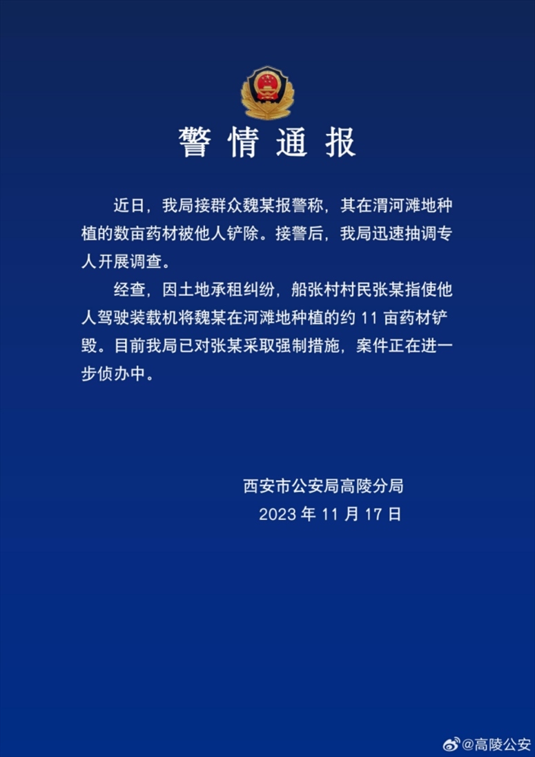 ·西安警方通報“十多畝藥材被鏟毀”:已對指使者采取強制措施。