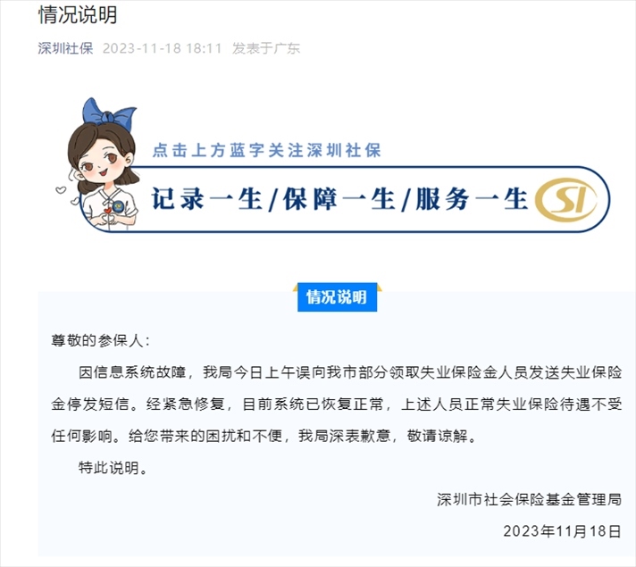 ·深圳社保局回應(yīng)停發(fā)失業(yè)保險金短信:信息系統(tǒng)故障,已恢復(fù)正常。