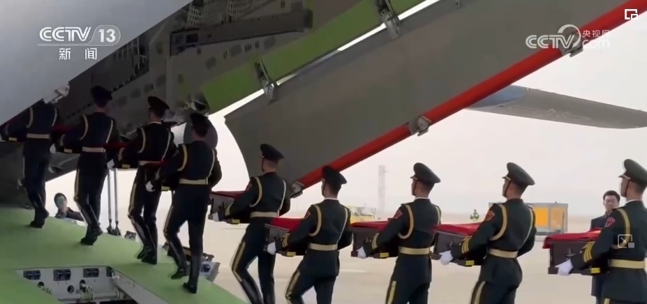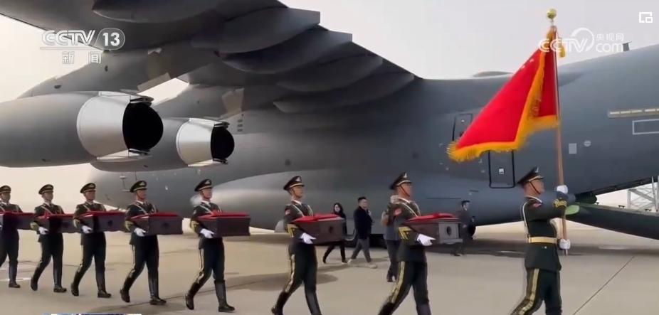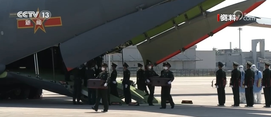 隨后,中方禮兵護送棺槨走上中國空軍運-20運輸機。北京時間11月23日上午,運-20運輸機從仁川國際機場起飛。