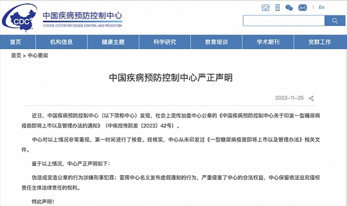 ·中疾控辟謠:從未印發(fā)過《一型糖尿病疫苗即將上市以及管理辦法》相關(guān)文件。