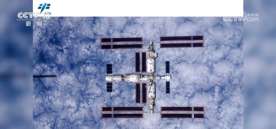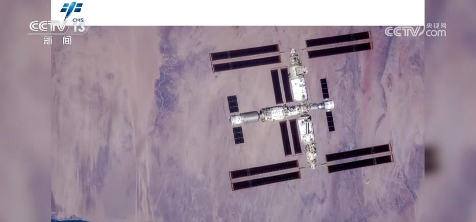 在繞飛至空間站正上方600米點(diǎn)位后,神舟十六號(hào)航天員乘組利用手持高清相機(jī),進(jìn)行了以地球?yàn)楸尘暗目臻g站組合體全景圖像拍攝。