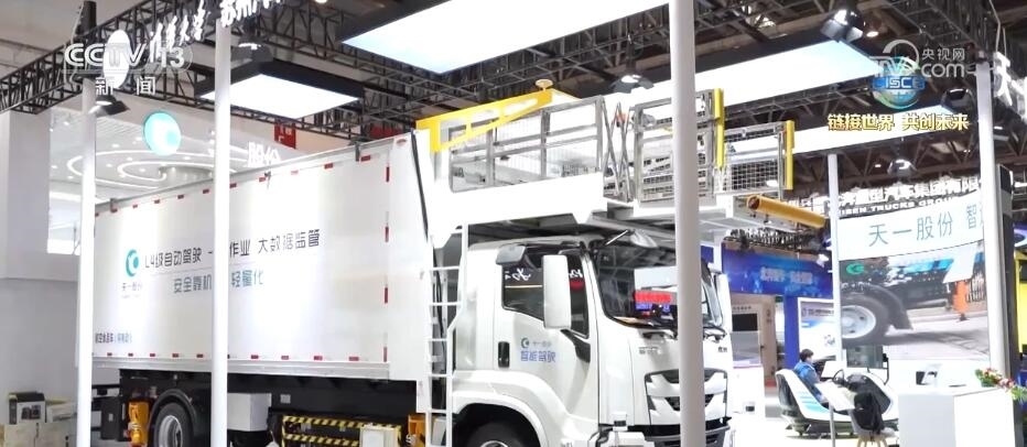 總臺(tái)央視記者 張歆:在本屆鏈博會(huì)上,我們也看到了許多智能專(zhuān)用車(chē)。大家可以看到在我身旁就是一臺(tái)智能航空食品專(zhuān)用車(chē),這臺(tái)重量達(dá)到21噸左右的“大塊頭”裝了許多個(gè)雷達(dá),通過(guò)5G的算法就能夠?qū)崿F(xiàn)無(wú)人駕駛和無(wú)人作業(yè)。