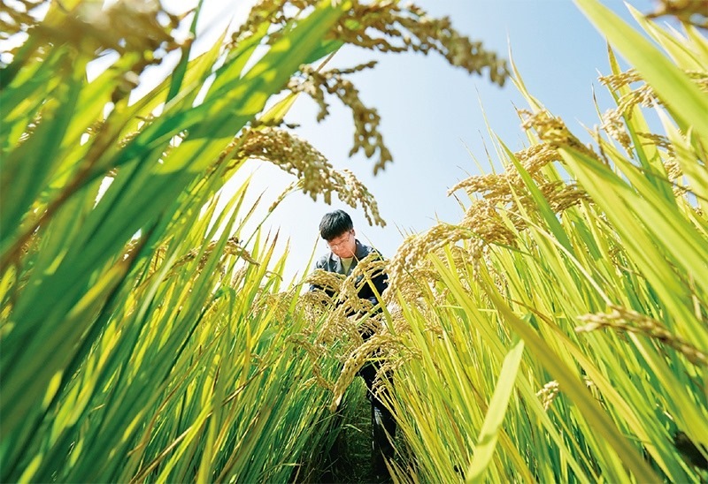 近年來(lái),河北省唐山市通過(guò)鹽堿地土壤科學(xué)改良、耐堿作物品種培育、適用耕作技術(shù)研究應(yīng)用等系列治理措施,在鹽堿地上開(kāi)發(fā)建設(shè)了高標(biāo)準(zhǔn)農(nóng)田88.6萬(wàn)畝,有效提高鹽堿地利用水平。圖為2023年10月11日,農(nóng)業(yè)科研人員在唐山市曹妃甸區(qū)第五農(nóng)場(chǎng)鹽堿地改良而成的高標(biāo)準(zhǔn)稻田內(nèi)工作。 新華社記者 楊世堯/攝