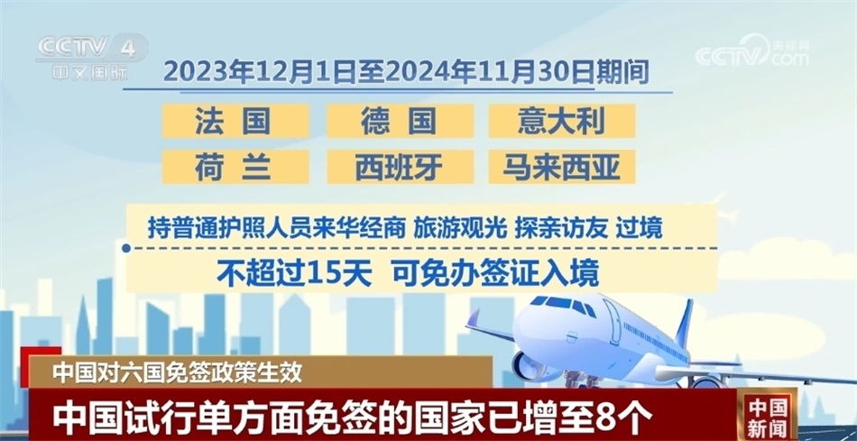 2023年12月1日至2024年11月30日期間,法國、德國、意大利、荷蘭、西班牙、馬來西亞6個(gè)國家持普通護(hù)照人員來華經(jīng)商、旅游觀光、探親訪友和過境不超過15天,可免辦簽證入境。至此,我國試行單方面免簽的國家從原先2個(gè)(文萊、新加坡)增加至8個(gè),覆蓋國家也從亞洲擴(kuò)大至歐洲。