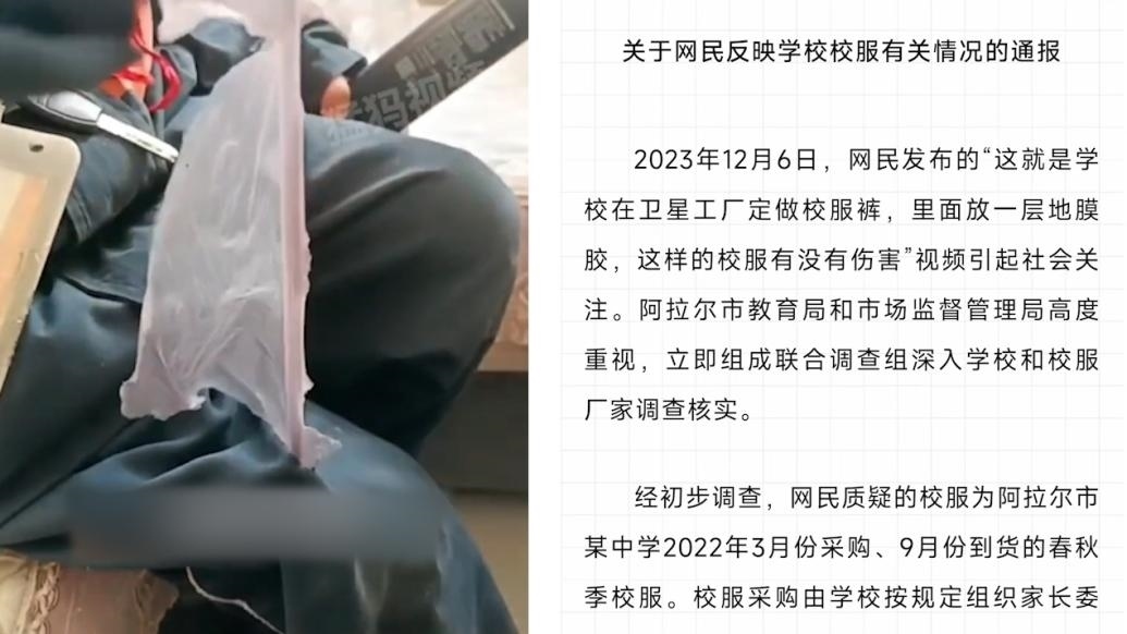 ·新疆阿拉爾官方通報校服褲夾層扯出疑似塑料膜:系脫落的校褲內(nèi)部復(fù)膜,已送檢。