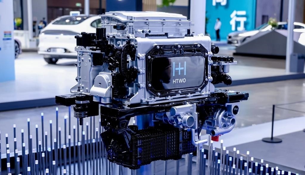 ?在2023世界新能源汽車大會技術展區(qū),車企展示的一款氫燃料電池系統(tǒng)。新華社記者夏天 攝