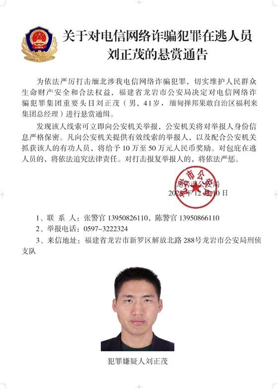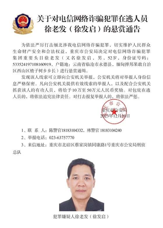 為依法嚴厲打擊緬北涉我電信網絡詐騙犯罪,切實維護人民群眾生命財產安全和合法權益,遼寧省大連市公安局決定對白所成、白應蒼(又名李云晨)、白應蘭(又名李夢娜)進行公開懸賞通緝;福建省泉州市公安局決定對魏懷仁、魏榕(又名陳榕)、魏青松(又名楊松)進行公開懸賞通緝;福建省龍巖市公安局決定對劉正祥、劉積光(又名李華光)、劉正茂進行公開懸賞通緝;重慶市公安局決定對徐老發(fā)(又名徐發(fā)啟)進行公開懸賞通緝。