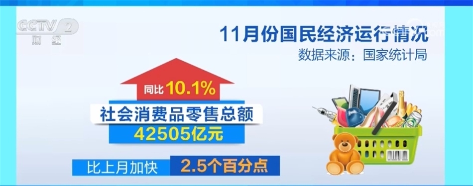 從消費看,出行類的商品銷售改善,服務消費潛力繼續(xù)釋放,市場銷售增勢良好。11月份社會消費品零售總額同比增長10.1%,比上月加快2.5個百分點,其中限額以上單位汽車類商品零售額增長14.7%,帶動作用明顯。