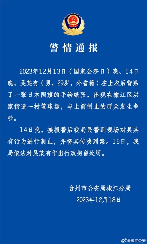·國家公祭日一男子身貼日本國旗出行?椒江警方:依法行政拘留。