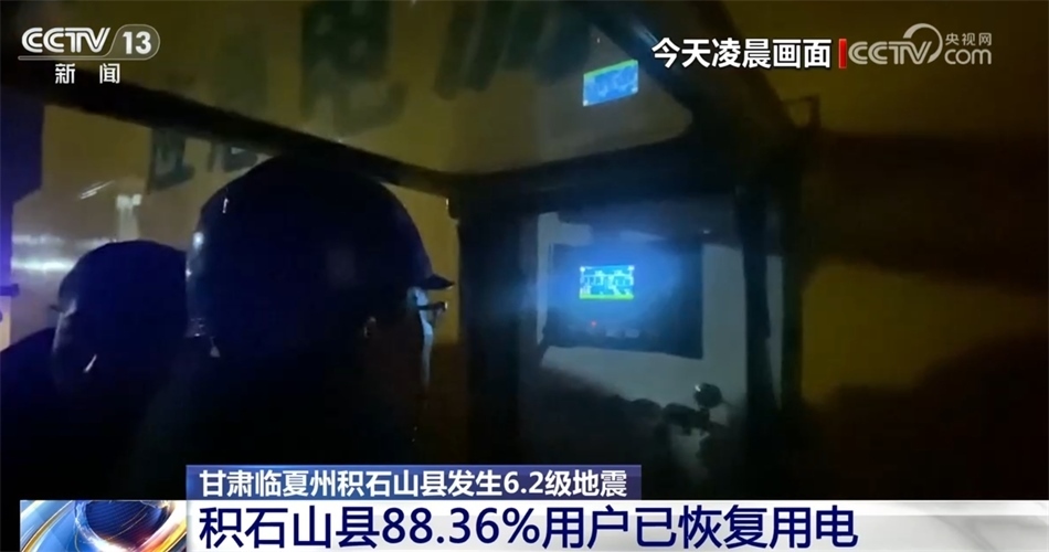 國家電網公司甘肅省電力公司第一時間啟動地震應急響應,共計派出18支應急搶修隊伍、11輛發(fā)電車、15臺發(fā)電機參與現(xiàn)場搶修。截至目前,2條35千伏線路已全部恢復送電,12條10千伏線路主線恢復,部分分支分段正在加緊搶修,已對積石山縣88.36%的用戶恢復供電。