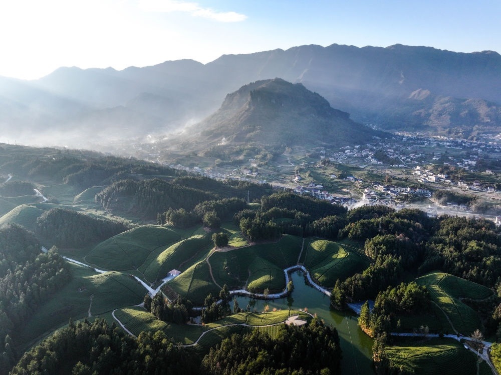 這是2023年12月5日拍攝的湖北省鶴峰縣走馬鎮(zhèn)楊柳池茶園風(fēng)光(無人機(jī)照片)。新華社記者 楊文斌 攝