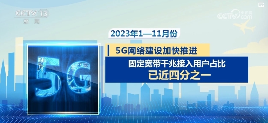 2023年1—11月份,5G網(wǎng)絡(luò)建設(shè)加快推進(jìn),固定寬帶千兆接入用戶占比已近四分之一。截至11月末,5G基站總數(shù)達(dá)328.2萬(wàn)個(gè),占移動(dòng)基站總數(shù)的28.5%。5G移動(dòng)電話用戶達(dá)7.71億戶,占移動(dòng)電話用戶的44.7%。千兆及以上接入速率的固定互聯(lián)網(wǎng)寬帶接入用戶達(dá)1.57億戶,占總用戶數(shù)的24.6%。