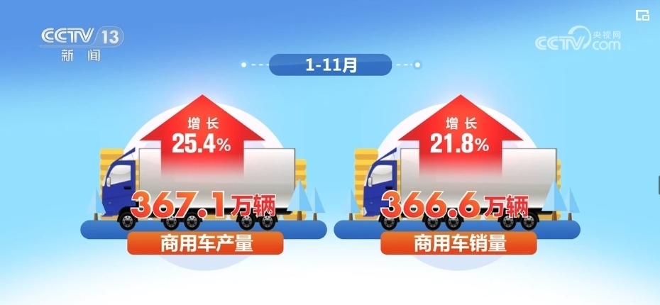 在1—11月份的數(shù)據(jù)中,商用車產(chǎn)銷量分別完成367.1萬(wàn)輛和366.6萬(wàn)輛,同比也實(shí)現(xiàn)了兩位數(shù)增長(zhǎng),分別增長(zhǎng)25.4%和21.8%。