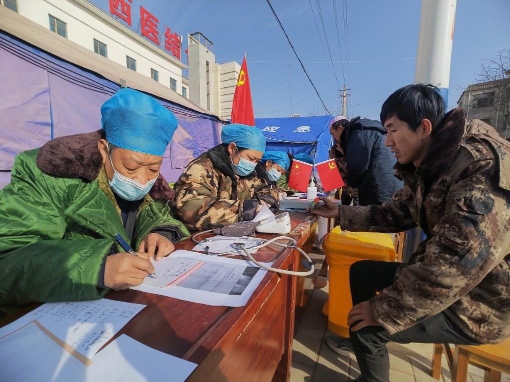 12月21日,在積石山中西醫(yī)結(jié)合醫(yī)院門外馬路邊,醫(yī)生為受災群眾看病。新華社記者 范培珅 攝