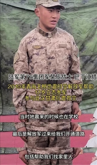 巴丁江措,第76集團軍某旅戰(zhàn)士。2010年青海玉樹地震時,解放軍幫他脫險。如今,同樣成為解放軍的他奮戰(zhàn)在甘肅抗震救災一線。他說:“我想對以前救我的人說,我?guī)椭烁嗳耍屗麄優(yōu)槲因湴?!?/p>