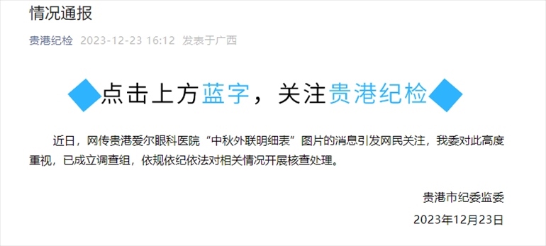 ·貴港市紀(jì)委通報(bào)“網(wǎng)傳愛(ài)爾眼科中秋外聯(lián)明細(xì)表”:已成立調(diào)查組,對(duì)相關(guān)情況開(kāi)展核查處理。據(jù)早前報(bào)道,網(wǎng)友爆料發(fā)布了兩張標(biāo)為“中秋外聯(lián)明細(xì)表”的圖片,其中涉及42名公職人員以及59000元額度的購(gòu)物卡,并在評(píng)論中透露上述圖片的涉事單位為貴港愛(ài)爾眼科醫(yī)院。