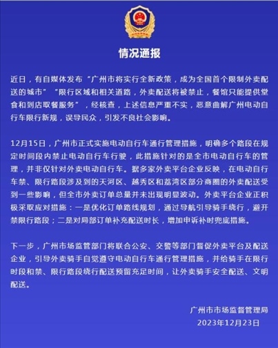 ·網(wǎng)傳廣州限制外賣(mài)配送?廣州市市場(chǎng)監(jiān)督管理局:嚴(yán)重不實(shí)。