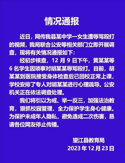 ·安徽望江縣教育局通報(bào)女生遭6人辱罵毆打,警方正調(diào)查處理。