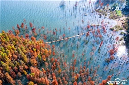 福建南平,延平區(qū)爐下鎮(zhèn)斜溪社區(qū)村洲頭島的落羽杉樹(shù)掩映閩江,色彩繽紛點(diǎn)綴冬日。