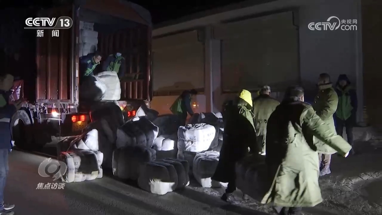 為了盡快給村民送去保障物資,刁四村村民的車隊(duì)日夜兼程。22日凌晨,歷經(jīng)32個(gè)小時(shí),帶著全村2000多人的囑托,這個(gè)車隊(duì)跨越1600公里,終于抵達(dá)了積石山縣的安集鎮(zhèn)。顧不上休息,刁四村的村民就和當(dāng)?shù)卮迕褚黄鸢沿浳镄读讼聛怼N遘囄镔Y,足足卸了三個(gè)小時(shí),其中包括2400件軍大衣、2580件棉被、1820副自發(fā)熱鞋墊。