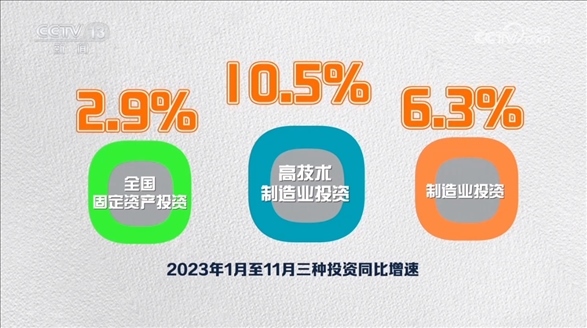 從投資看,2.9%、6.3%、10.5%,這三個數(shù)字分別是今年1—11月全國固定資產(chǎn)投資、制造業(yè)投資和高技術制造業(yè)投資的同比增速。
