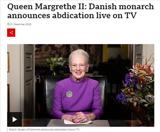 ·丹麥女王瑪格麗特二世宣布將于2024年1月14日退位。