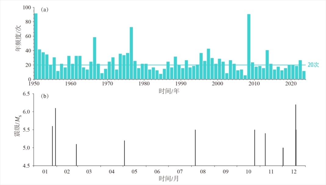 2023年以來(lái)大陸地區(qū)發(fā)生5級(jí)以上地震11次,最大為12月18日甘肅積石山6.2級(jí)地震,活動(dòng)水平較2022年(27次,最大為2022年1月8日青海門源6.9級(jí)地震)和歷史平均水平(20次)明顯偏弱(圖a)。2023年5級(jí)以上地震時(shí)間分布不均勻,1月至2月發(fā)生3次,3月至9月僅發(fā)生2次,10月至12月增至6次,出現(xiàn)5級(jí)以上地震由弱轉(zhuǎn)強(qiáng)的活動(dòng)特征(圖b)。