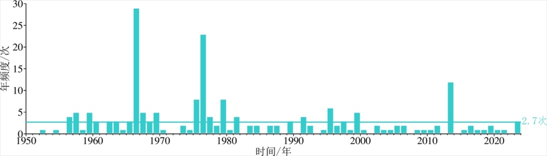 2023年以來(lái)大陸東部及附近海域發(fā)生5級(jí)以上地震3次,分別為6月24日北部灣5.0級(jí)、8月6日山東平原5.5級(jí)和10月23日廣東南澳縣海域5.0級(jí)地震,地震活動(dòng)水平較2022年(0次)顯著增強(qiáng),為 2014 年以來(lái)活動(dòng)頻次最高年份。