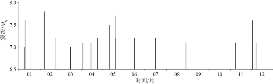 2023年全球7級(jí)以上地震震級(jí)時(shí)序圖