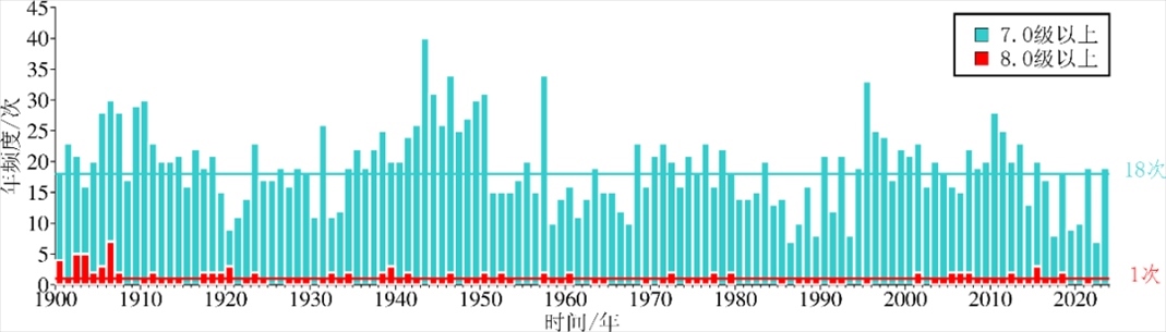 2023年全球未發(fā)生8級(jí)以上地震,最近一次為2021年7月29日美國(guó)阿拉斯加以南海域8.1級(jí)地震。2023年全球發(fā)生7級(jí)以上地震19次,與1900 年以來(lái)年均頻次(18 次)基本持平,顯著高于2022年7級(jí)以上地震的活動(dòng)水平(7次)。