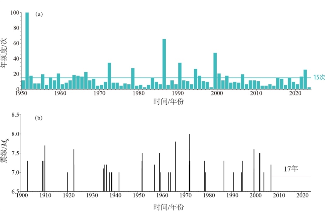 2023年臺(tái)灣及近海發(fā)生5級(jí)以上地震3次,最大為10月24日臺(tái)灣花蓮縣海域5.9級(jí)地震,活動(dòng)水平較2022年(26次)顯著減弱,為2000年以來(lái)頻次最低的年份。且自2006年12月26日臺(tái)灣恒春海域7.2級(jí)地震后,臺(tái)灣7級(jí)以上地震已平靜17年,為1900年以來(lái)最長(zhǎng)平靜。